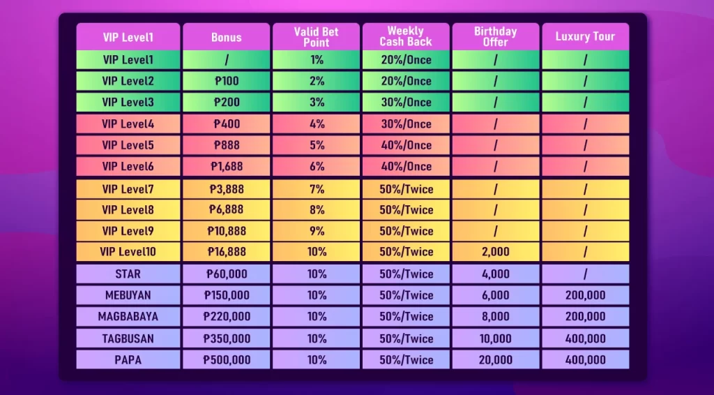 Bonus: Starting from Level 2, players receive bonuses for each level-up, credited directly to your Game Credit. Moreover, the maximum bonus is up to ₱500,000 for Level 15.